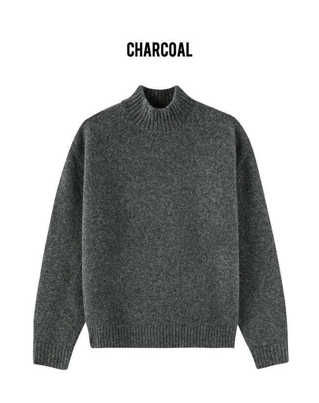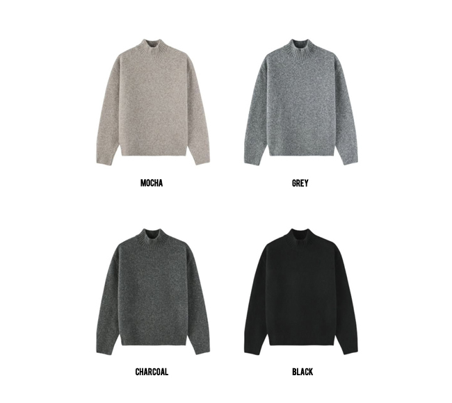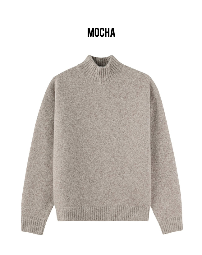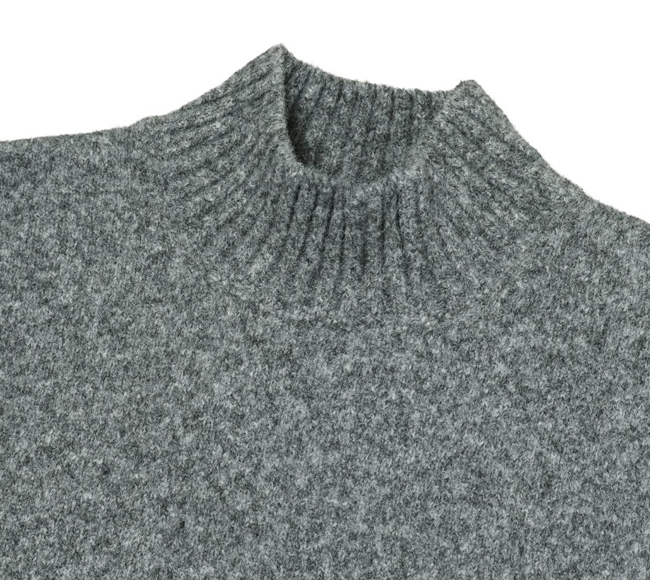 To prevent any lifting around the neckline, precise knitting techniques and linking stitches are applied, creating a stable and meticulously finished mock-neck design that delivers a clean and refined silhouette.