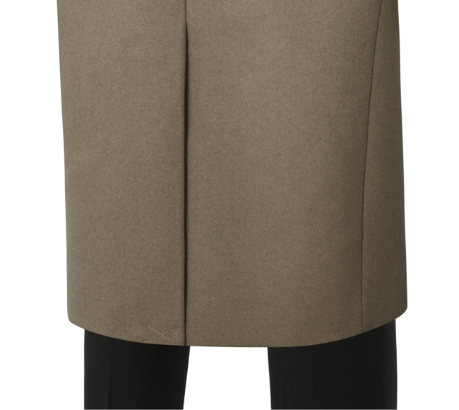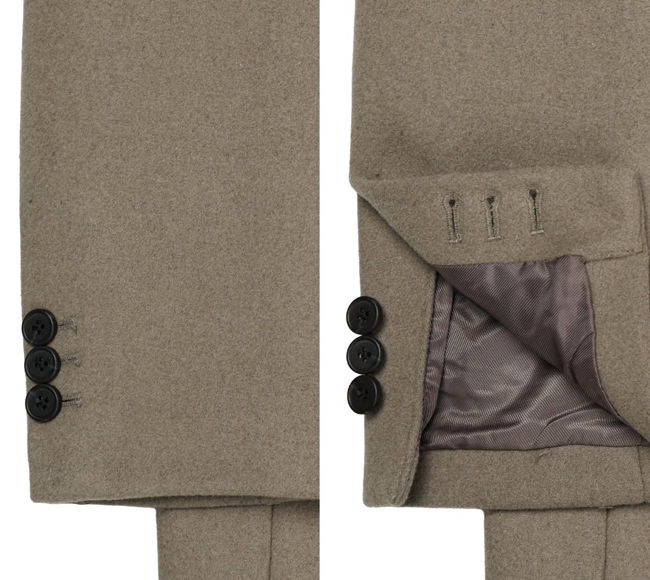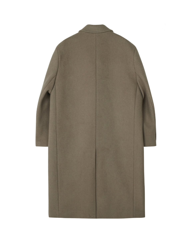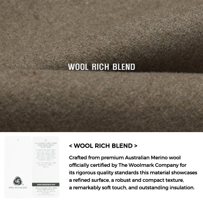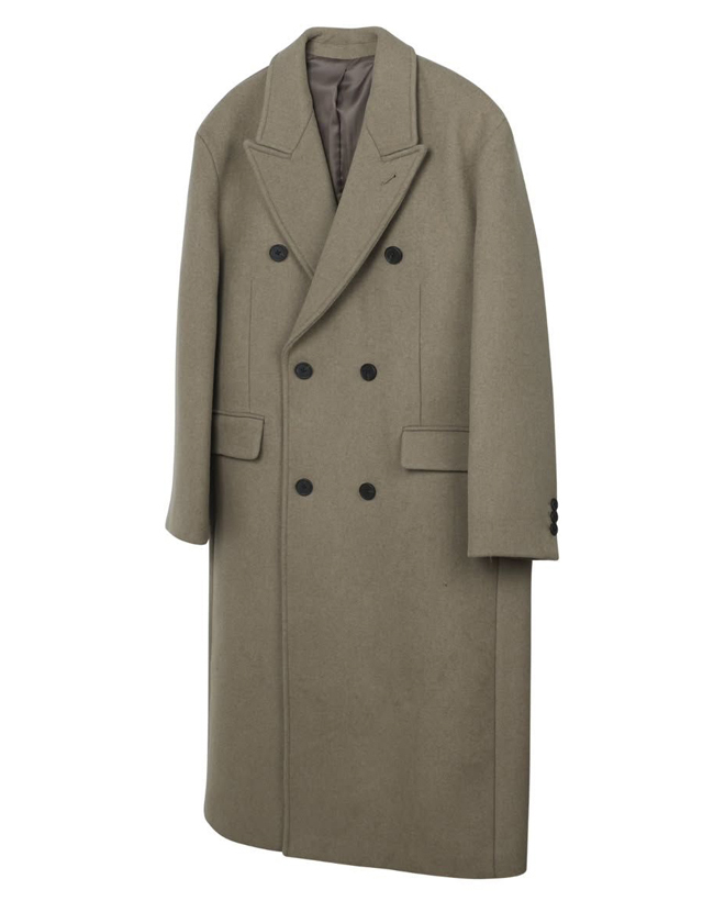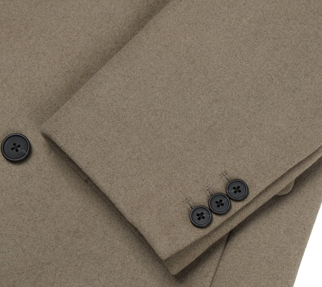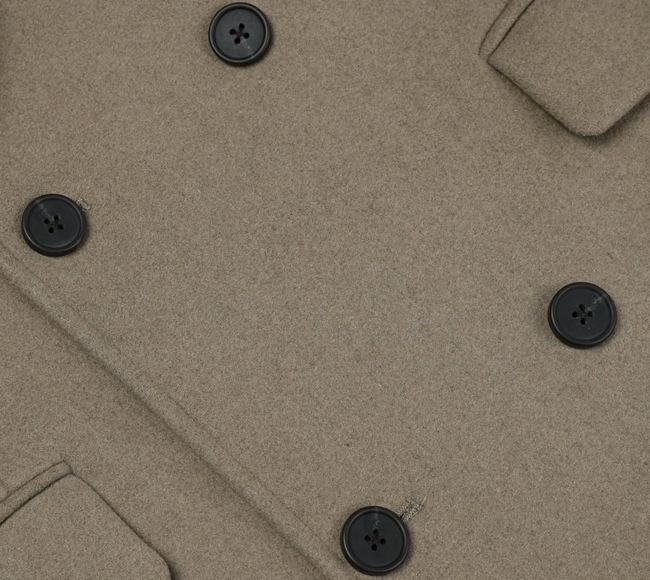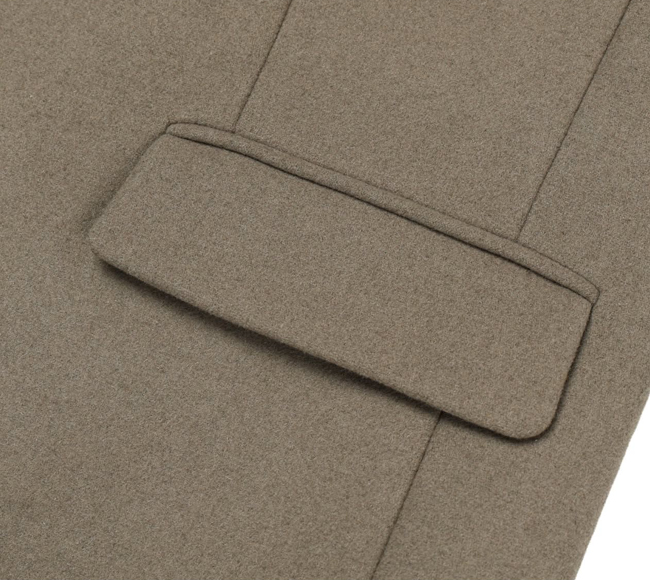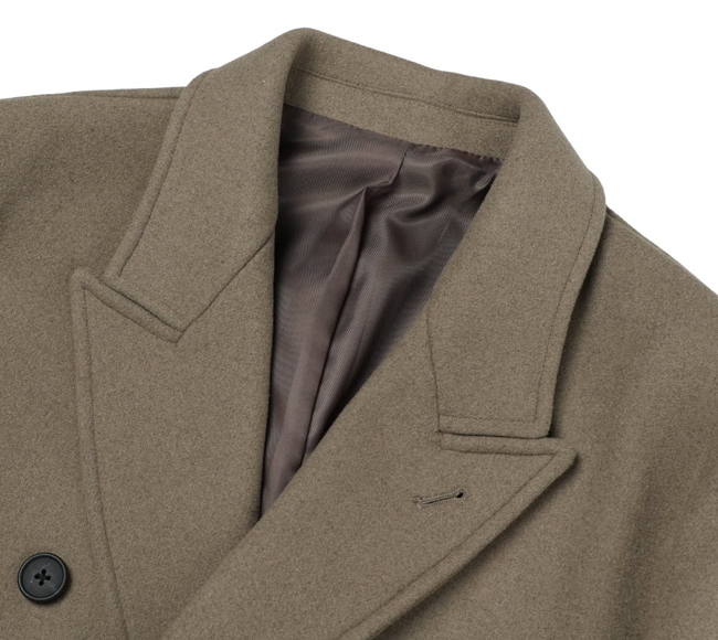 Crafted with a Merino wool blend and a substantial 23oz double-faced fabric, this coat offers a soft yet firm hand feel with outstanding warmth. The brushed felt finish preserves the natural nap of the wool, giving it a refined sheen and a luxurious appearance. Through high-temperature, high-pressure steaming, the surface is evenly compacted and flattened to create a smooth, polished finish.