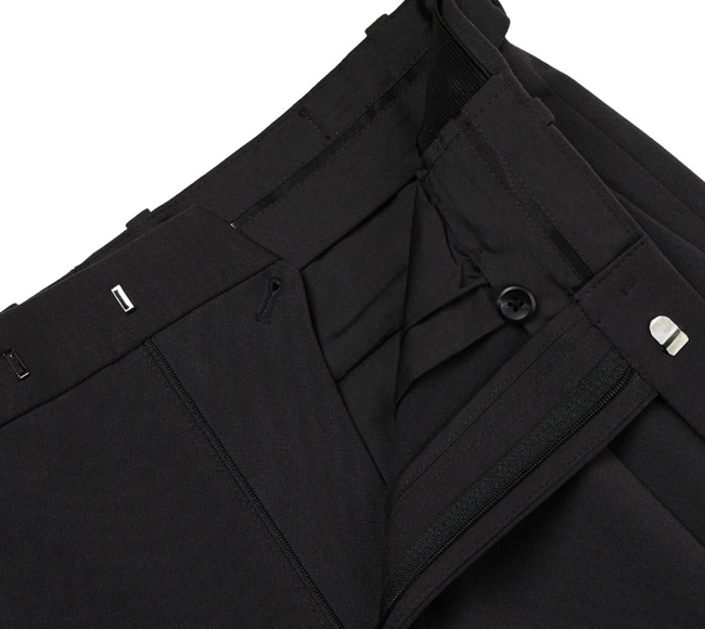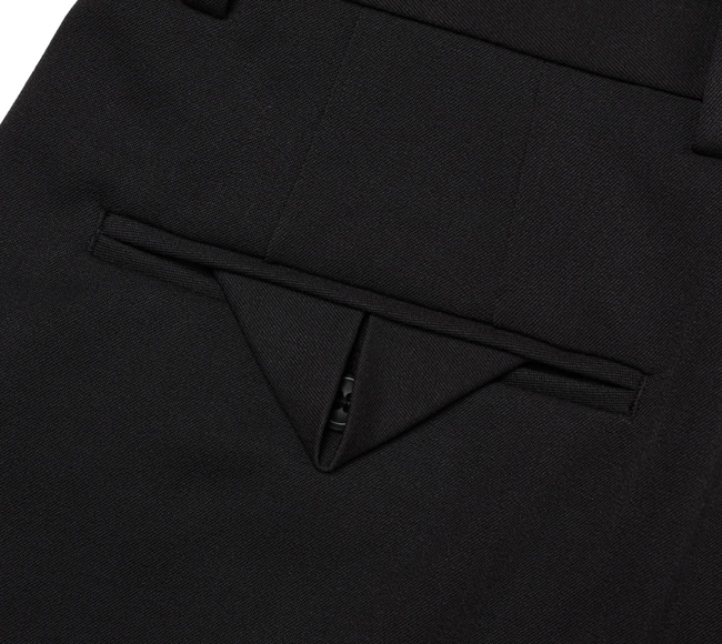 To provide a secure fit, natural horn buttons are used on the back pockets, preventing the inner pocket lining from lifting when worn.