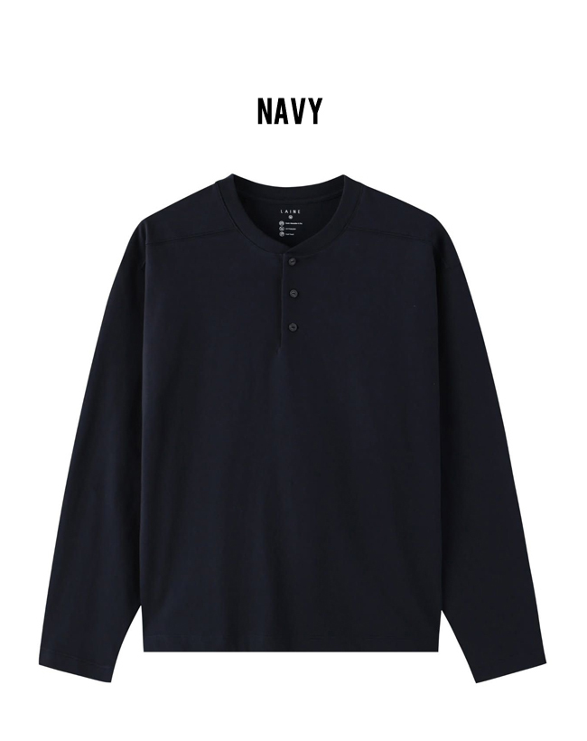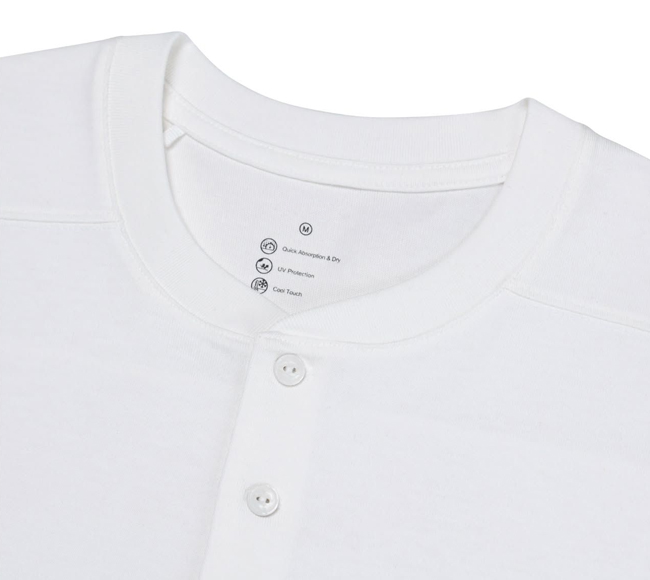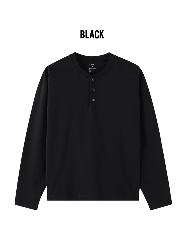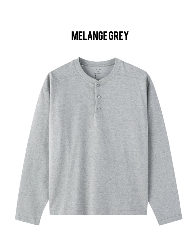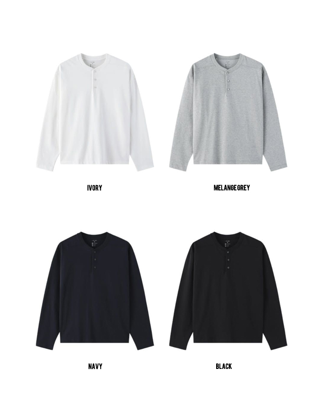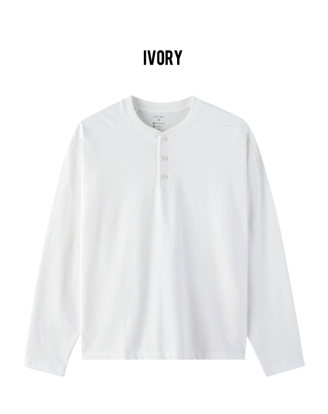 The standard-fit Henley long-sleeve T-shirt is treated with a special ammonia finishing process, offering excellent recovery to effectively minimize wrinkles and ensure easy care.