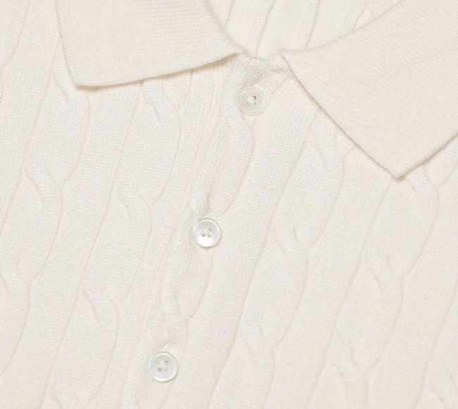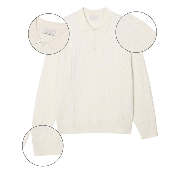 To prevent gaping at the collar side, precise knitting techniques and linking stitch are applied, creating a stable and refined round collar line with a clean silhouette.