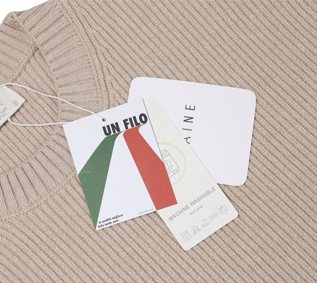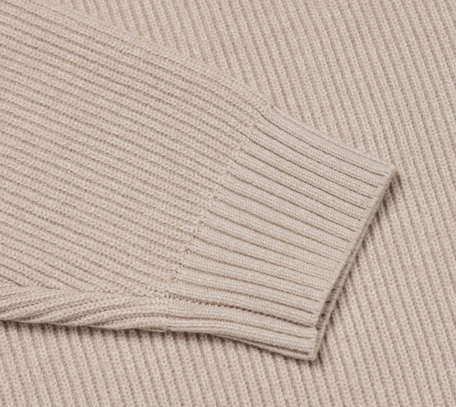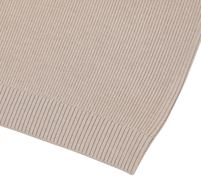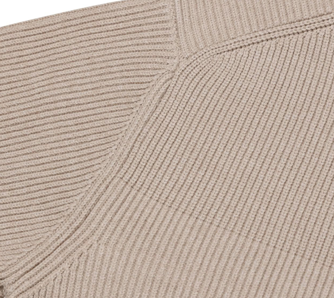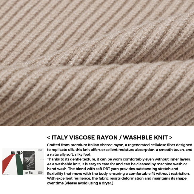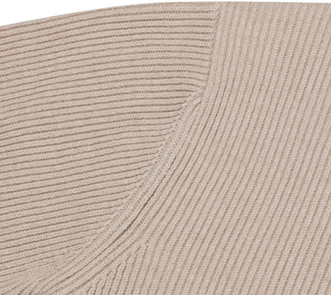 To prevent gaping at the side neck, this piece is crafted with precise knitting techniques and linking stitch, creating a stable, refined turtleneck line with a clean silhouette.